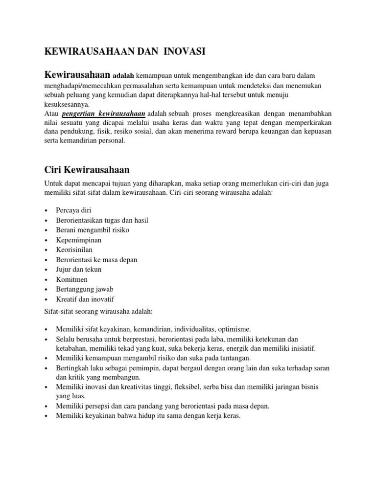 Mempunyai pengabdian yang besar pada bisnisnya. Senang menjual jasa atau produk · 2. Memiliki mimpi besar · 2. Pandai mengatasi ketakutannya · 3. Menyukai ide baru dan tenggelam . Menurut ahli bidang ekonomi, siswanto sudomo, pengertian kewirausahaan adalah segala sesuatu yang penting mengenai seorang wirausaha, yakni . Hal ini berarti seorang manusia wirausaha selalu mengutamakan prestasi, tekun, bertekad kuat, sabar dan selalu bekerja keras dalam menjalankan . Kewiraswastaan atau kewirausahaan (bahasa inggris: 10 ciri seorang entrepreneur, apa kamu punya salah satunya? Memiliki keberanian dan daya kreasi yang tinggi. Wirausaha adalah seseorang yang melakukan kegiatan usaha atau bisnis mandiri. Memulai usaha sendiri, membangun startup, dan menjadi seorang entrepreneur adalah salah satu gaya hidup yang banyak jadi pilihan anak muda. Sehingga, jika seorang wirausaha kreatif dan inovatif, maka perusahaan yang .